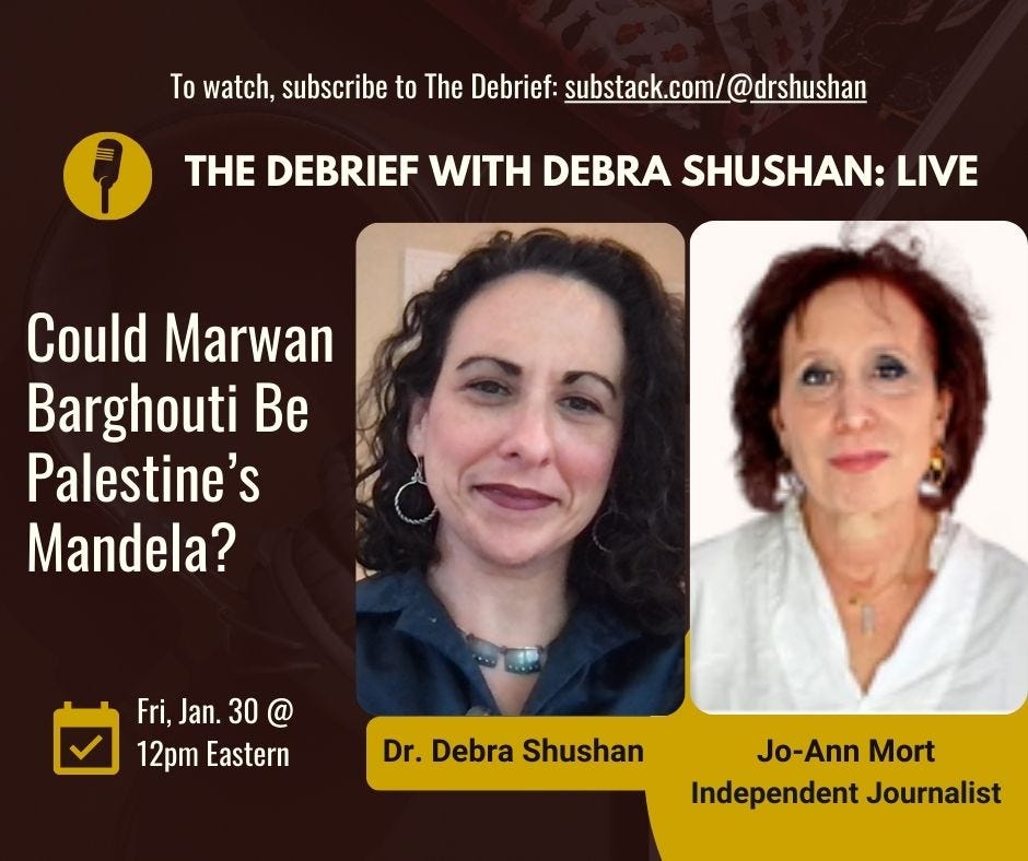 Following her reporting trip to Israel-Palestine, Jo-Ann and I will talk about her interview with the wife and son of Marwan Barghouti, the expanding international campaign to release him from Israeli prison, and whether Barghouti has the potential to be Palestine’s Mandela — if Israel would (be pressured to) free him. Be sure to check out Jo-Ann’s just-published piece in The New Republic. I’ll reserve some questions for Jo-Ann based on her decades of experience as a political organizer, peace activist, and freelance journalist.